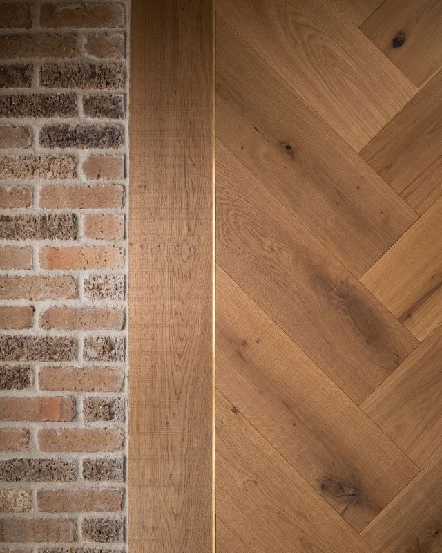 From the intricate herringbone patterns bordered by delicate brass inlays to the seamless transition against reclaimed brickwork, this project showcases the incredible versatility of wide-plank oak.