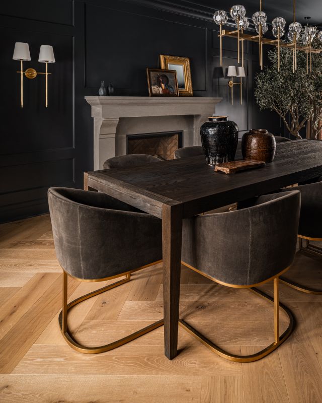 In the dining room, the flooring provides a light, airy contrast to the dramatic, dark-panelled walls and velvet seating. Moving into the nooks and sun-drenched transitions, the natural grain of the oak complements the soft linens and marble accents, proving that true quality underfoot is the ultimate design essential.